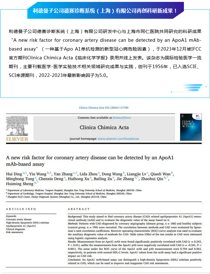 科研创新 │ 开云(中国)子公司德赛诊断系统(上海)有限公司联合上海市同仁医院再创科研新成果